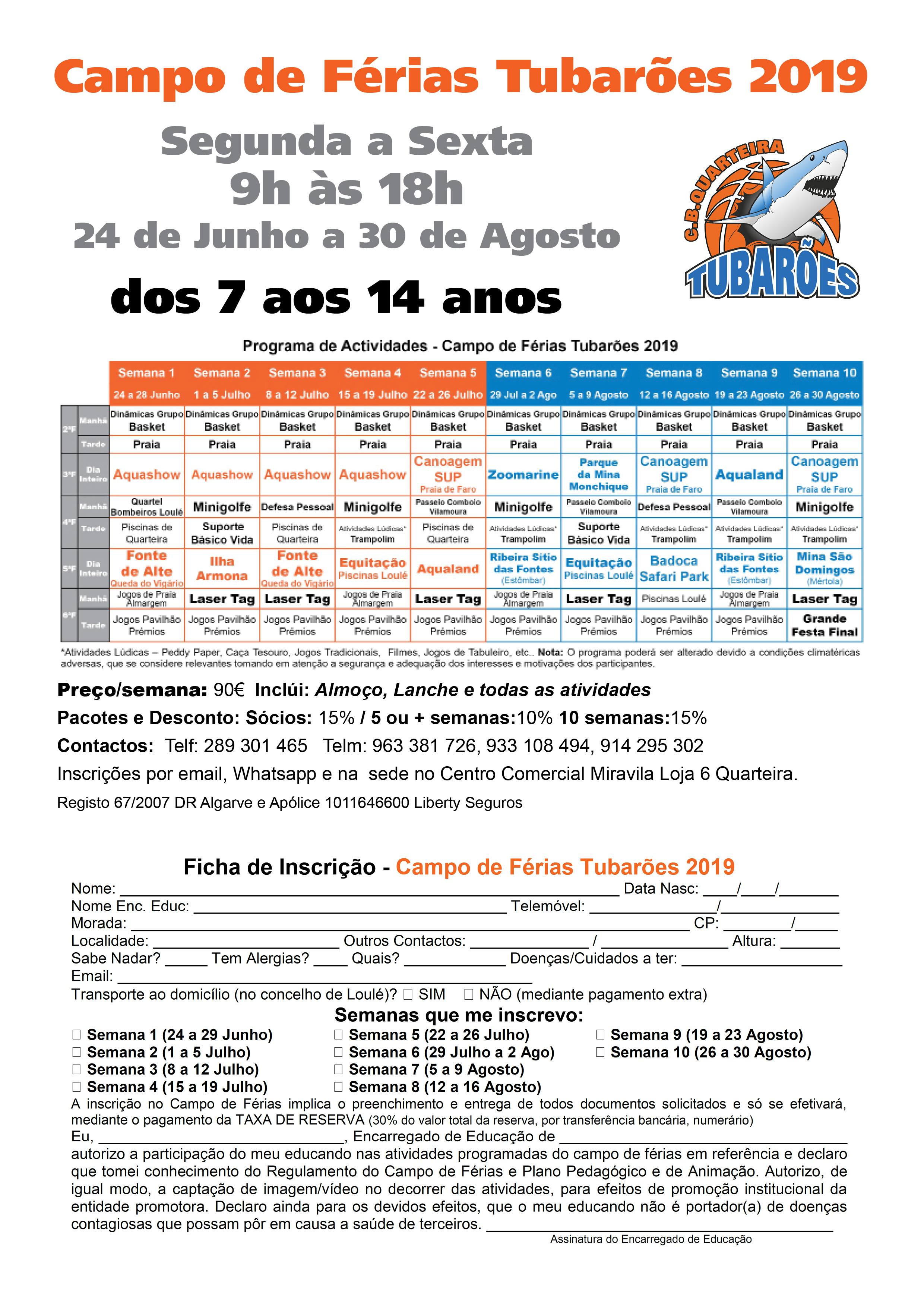Com o objetivo principal de ocupar os tempos livres com a prática desportiva e lazer, é indicado para todas as crianças e jovens dos 7 aos 14 anos. Durante os meses de julho e agosto, de 2ª a 6ª das 9h às 18h, poderão optar pelas semanas que preferirem, ou todas as semanas. (Inclui almoço e lanche)